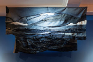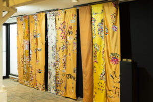 Instalación textil con telas de cortina intervenidas con trozos de telas sostenidas con gacillas