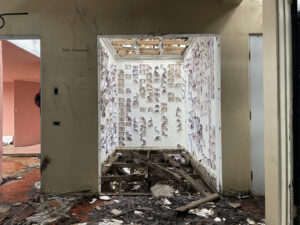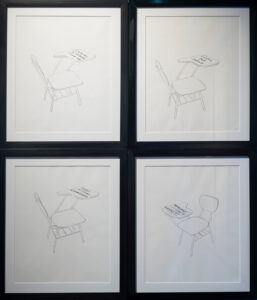 En Pupitres, Monge transforma el pupitre escolar, símbolo tradicional de aprendizaje, en un objeto de reflexión sobre las cicatrices que la violencia puede dejar en la memoria colectiva. Al reemplazar las superficies de madera por mármol y grabar en ellas textos relacionados con la educación y la memoria, la artista subraya la importancia de recordar y aprender del pasado para evitar la repetición de la violencia. Este acto de grabar sobre mármol, un material duradero y solemne, simboliza la necesidad de una educación que no solo transmita conocimientos, sino que también fomente la reflexión crítica y el compromiso con la paz y la equidad.