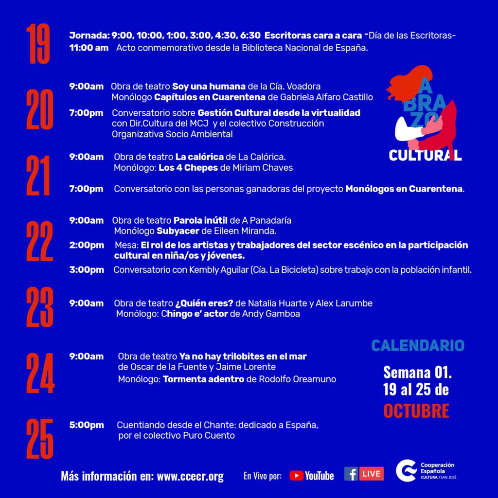 Este mes de octubre el Farolito va a intentar reconstruir esos abrazos culturales entre las instituciones y artistas de España y Costa Rica. Ambos están sufriendo de la misma manera el aislamiento, el miedo, la crisis económica, la quiebra más absoluta y la enorme pérdida de valores que esta enfermedad mundial está desencadenando.