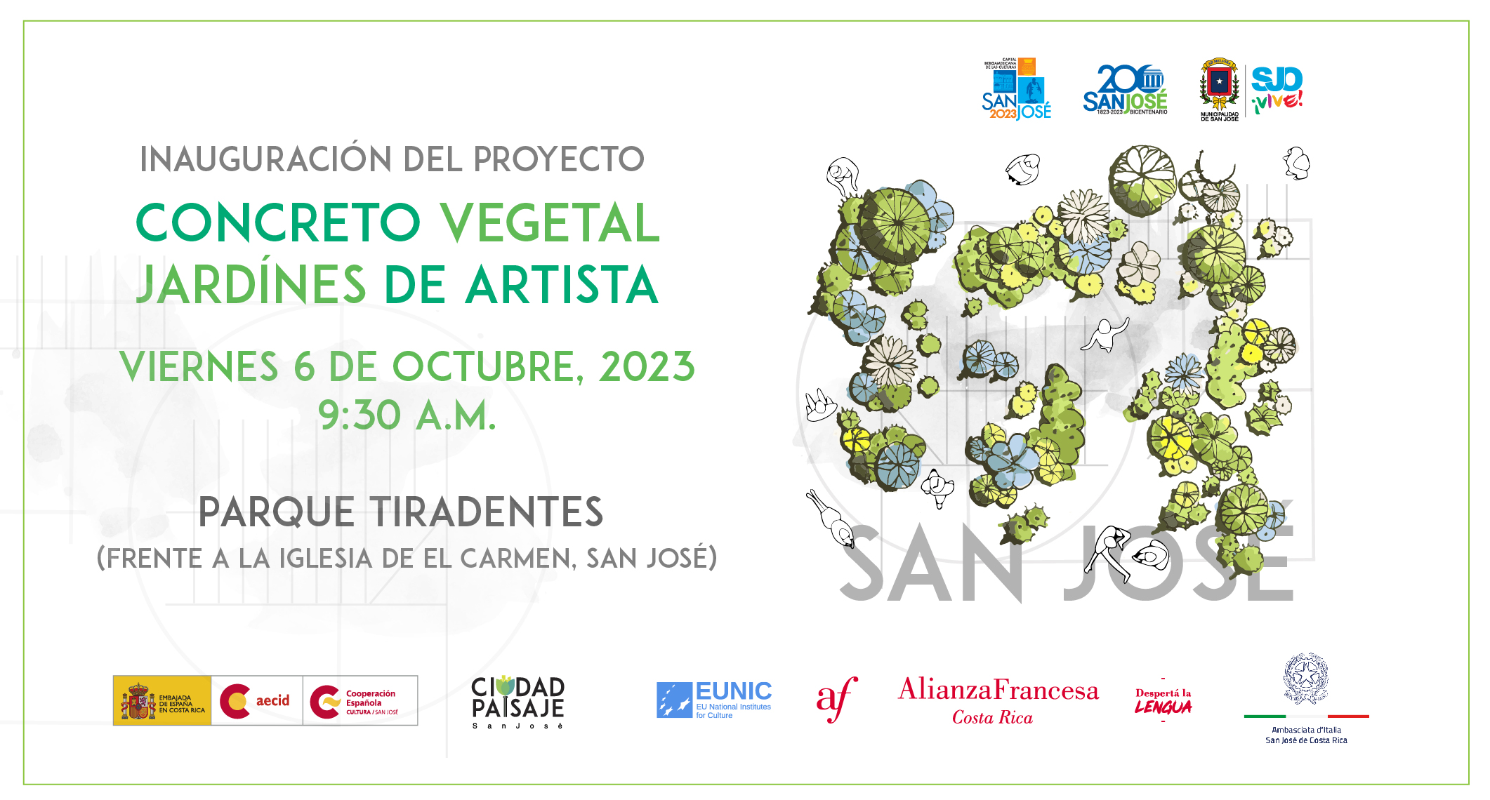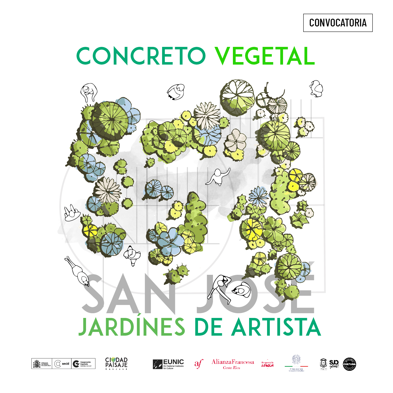 La Alianza Francesa, la AECID (Centro Cultural de España) y la Embajada de Italia se complacen en lanzar esta convocatoria para el proyecto Concreto vegetal – Jardines de artista, cuyo objetivo es la intervención de espacios y lotes baldíos de la ciudad de San José por parte de artistas de Francia, Italia y España, para transformarlos en espacios verdes donde se propicie la convivialidad y la protección del medio ambiente.