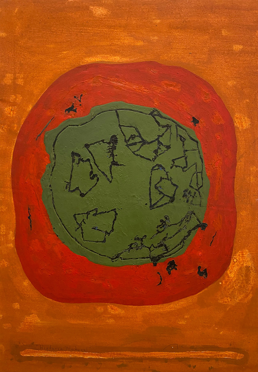 En Historia natural, (2012), nos presenta una esfera, embrión o globo terráqueo verde que contiene cartografías o signos de un lenguaje desconocido en negro, centrando una composición rodeada de magma rojo, en un fondo ocre naranja, es una obra que trasmite calor, fluctuación, vida en peligro; estamos ante una visión microscópica celular donde algunos elementos quieren salirse del núcleo o de una visión macroscópica donde un mundo se ve amenazado por un aumento extremo de la temperatura. (¿cambio climático?)―Ricardo Ramón Jarne