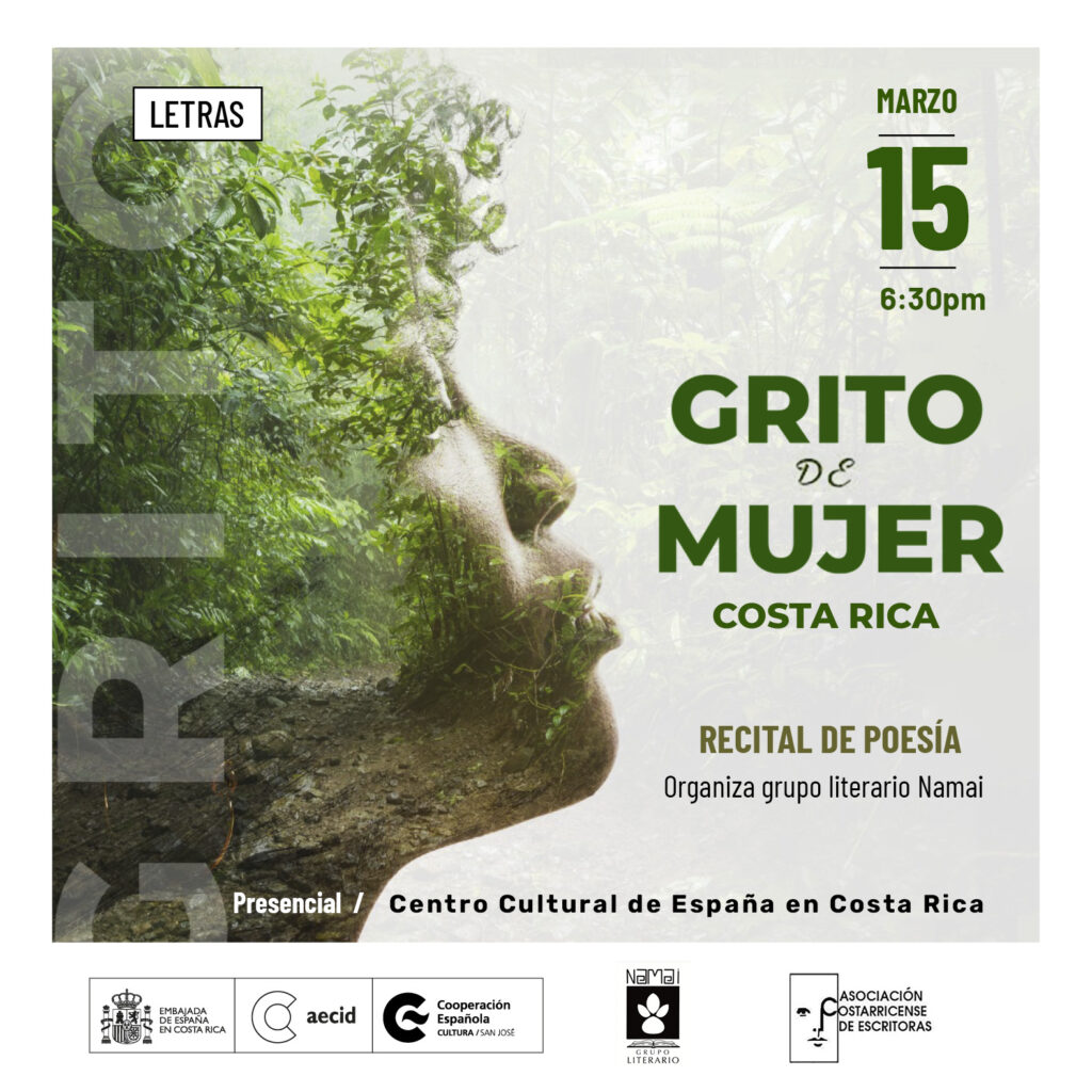 En torno a la celebración del mes de la mujer, acogemos el recital Grito de Mujer Costa Rica en conexión con nuestra madre tierra. Este recital es organizado por el grupo literario Namai y la Asociación Costarricense de Escritoras, y forma parte del Festival Internacional Grito de Mujer cuyo objetivo es reunir a  poetas y artistas solidarios en diversos países, para rendir un merecido tributo a las mujeres.