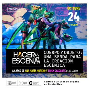 En esta conferencia performática, nos adentraremos en el proceso creativo de la plástica escénica de EX–áNIMA (Ana María Moreno y Erick Cascante). A través de la imagen, el movimiento, la indumentaria y el objeto los participantes explorarán un senda para la creación y diseño escénico.
