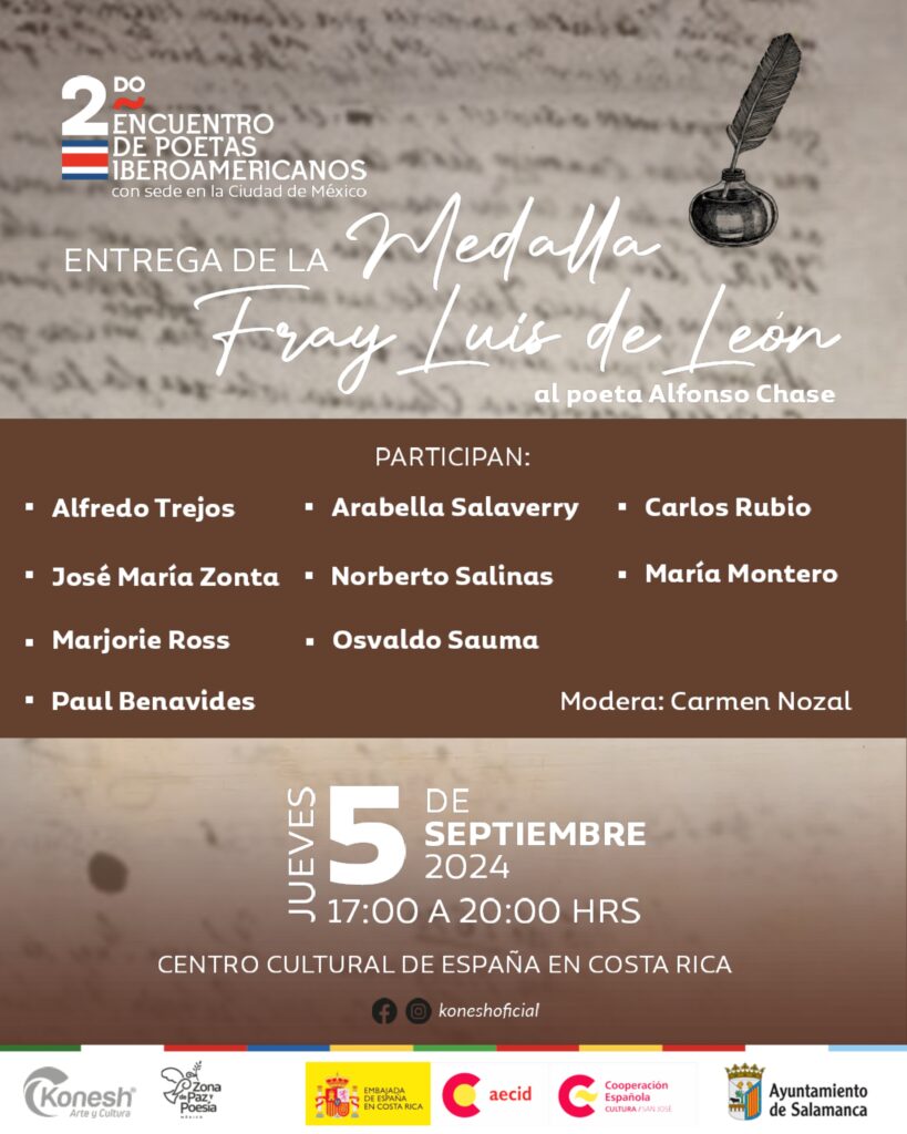 El Segundo Encuentro de Poetas Iberoamericanos con sede en la Ciudad de México, este año se centra en Costa Rica y rinde homenaje a dos de sus grandes poetas: Laureano Albán y Julieta Dobles. La clausura se llevará a cabo en el Centro Cultural de España en Costa Rica, donde la doctora Carmen Nozal entregará la medalla Fray Luis de León, financiada por el Excmo. Ayuntamiento de Salamanca, al poeta Alfonso Chase por su aporte a las letras universales y la calidad extraordinaria del conjunto de su obra poética.