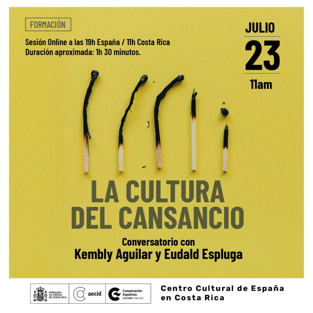 Este es el esbozo de un problema mayor que Eudald Espluga, ensayista y experto en crítica cultural, y Kembly Aguilar, traductora, productora, actriz y titiritera costarricense, nos ayudarán a comprender. ¿Cómo puede la cultura intervenir en esta inercia que opera como un impasse incapacitante? ¿A qué tipo de producción cultural y artística da lugar esta dinámica? ¿De cuánta salud goza la cultura? ¿Qué imaginarios y futuros pueden albergar este tipo de sociedades? ¿Qué transformaciones debe vivir nuestro mundo para dejar atrás la burocratización, la fatiga y la pobreza?