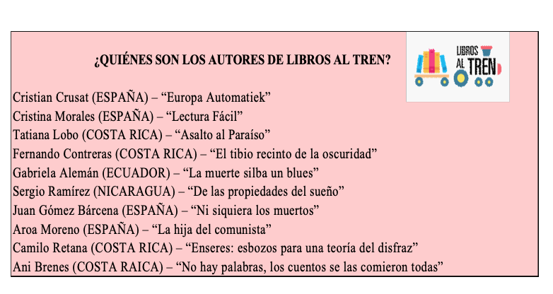 Desde este mes de junio todos los usuarios del servicio de trenes de pasajeros del GAM podrán encontrar en los trenes afiches con extractos de obras literarias tanto de autores nacionales como internacionales que podrán ir leyendo mientras se trasladan a sus destinos, se trata de cuatro autores nacionales y seis internacionales.
