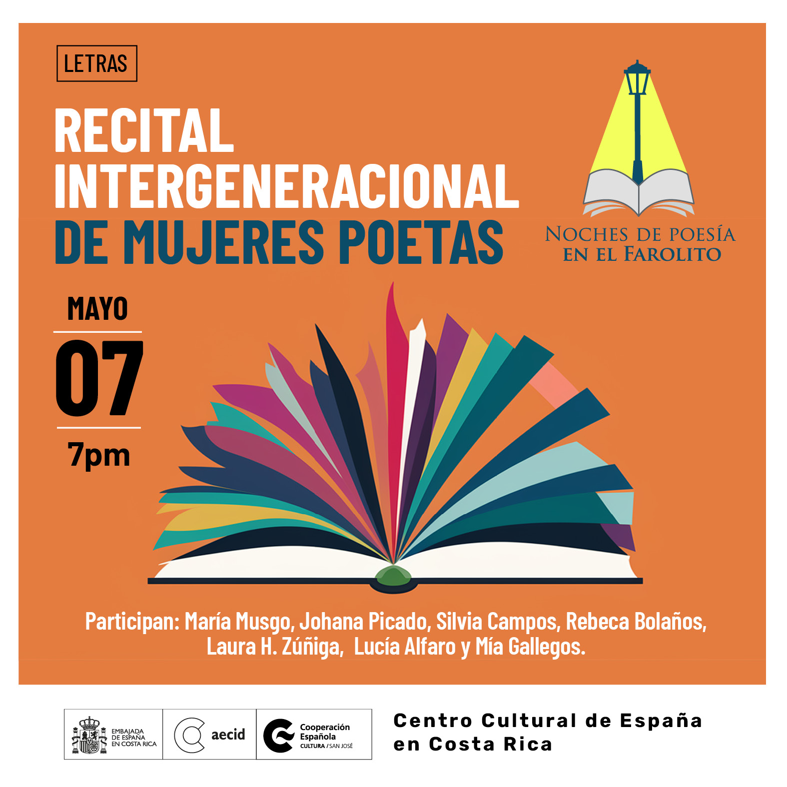 En el marco de la exposición Estirando el tiempo, ¡y no me llames vieja!, tendrá lugar un recital intergeneracional de mujeres poetas como parte de las Noches de Poesía en el Farolito del mes de mayo. Con esta actividad buscamos propiciar un diálogo poético que conjugue voces de distintas edades que nos permitan tomarle el pulso a la actualidad de la poesía femenina. Nos acompañarán las poetas María Musgo, Johana Picado, Silvia Campos, Rebeca Bolaños, Laura H. Zúñiga, Lucía Alfaro y Mía Gallegos.