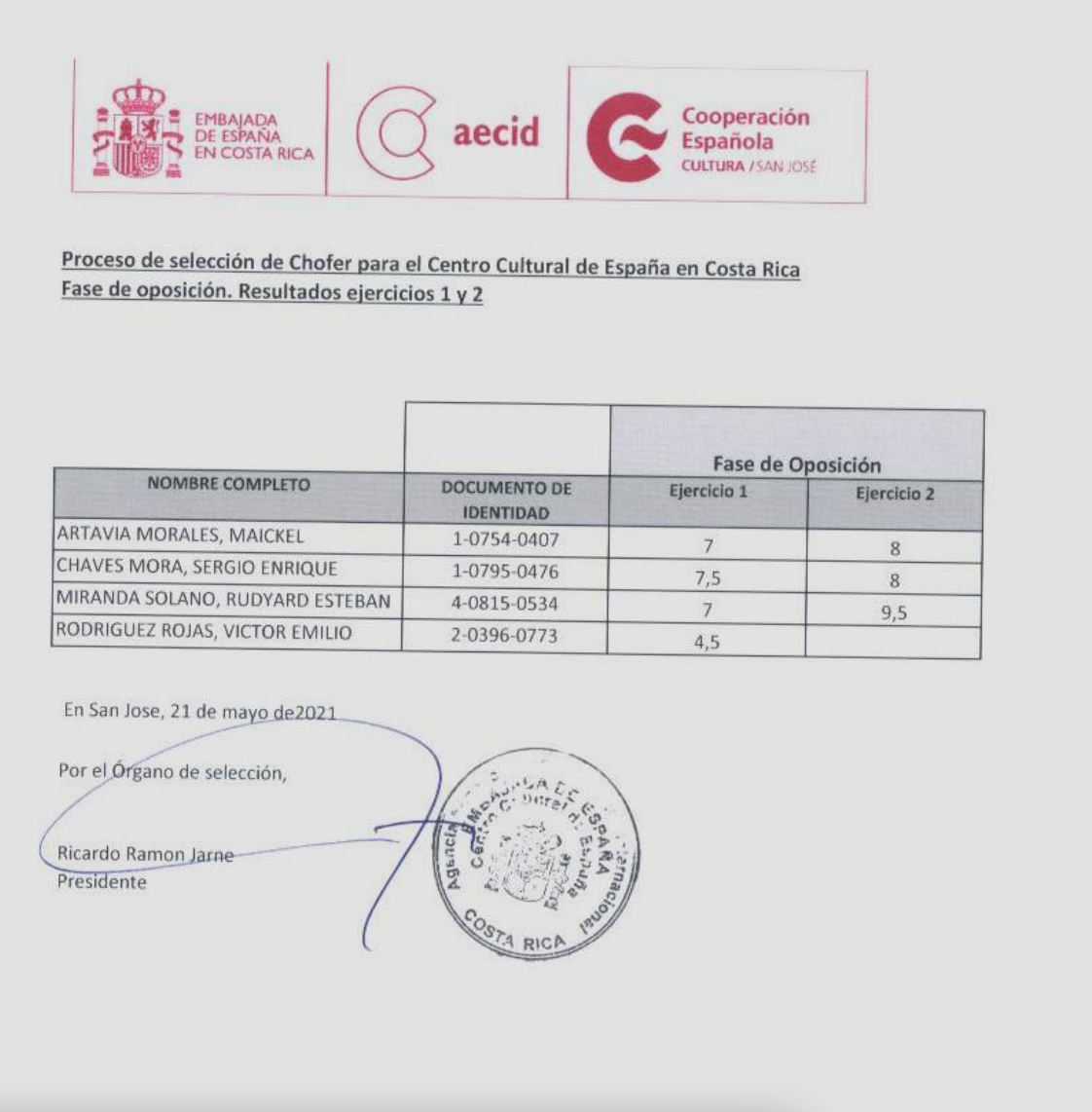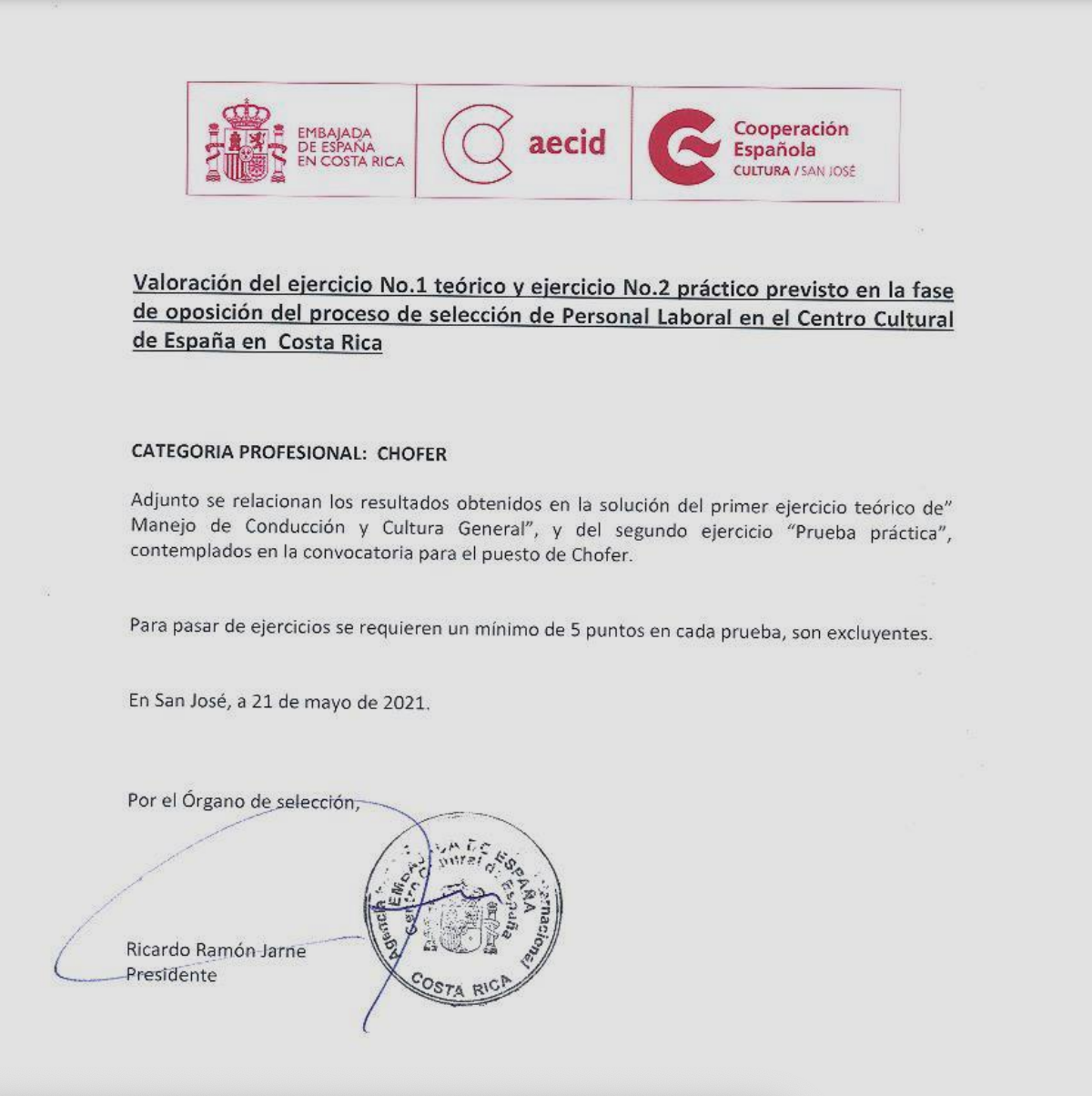 Relación de aspirantes admitidos con valoración ejercicio no.1 y no.2 de la fase de oposición del proceso de selección para cubrir una vacante de chofer en el Centro Cultural de España en San Jose de Costa Rica.