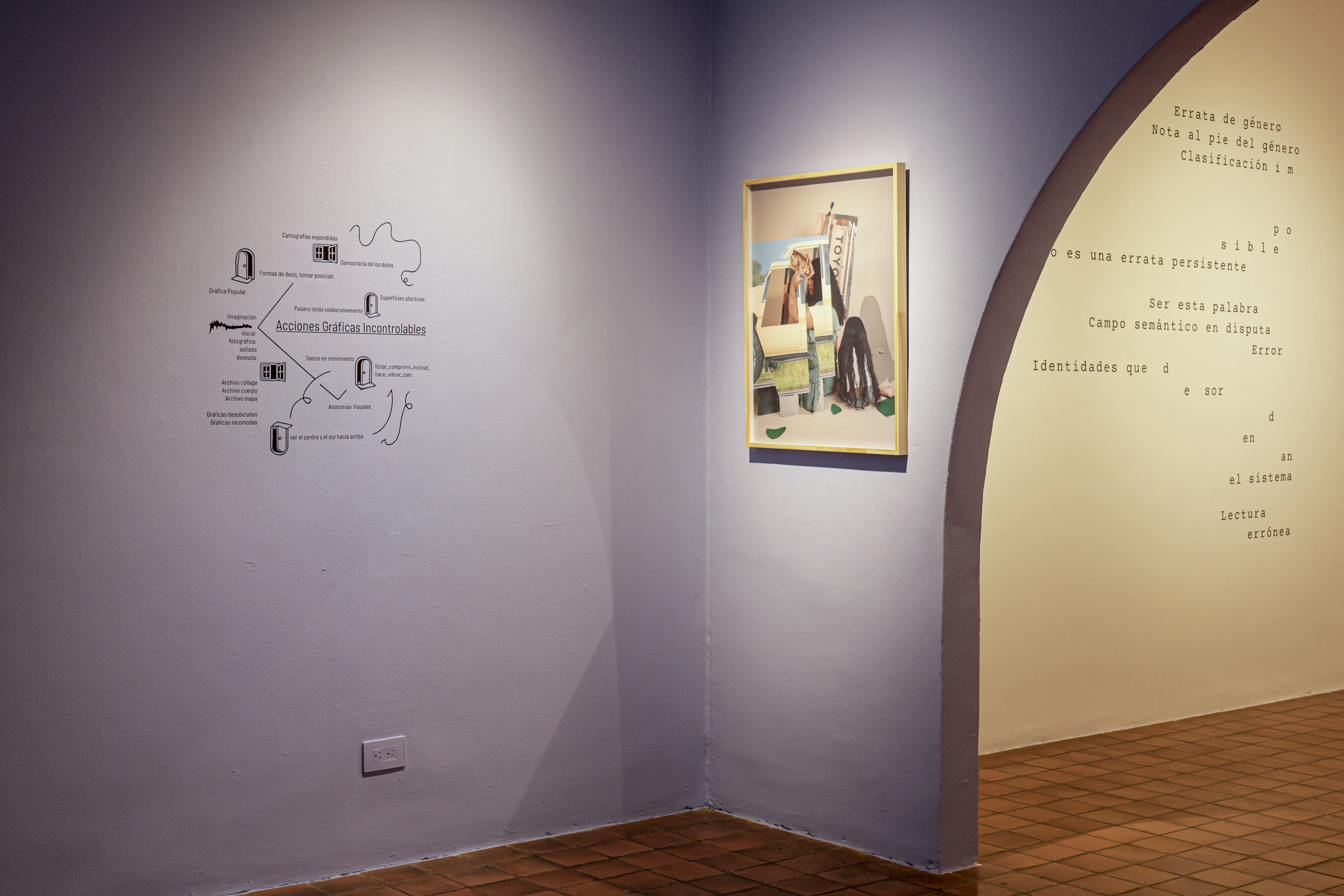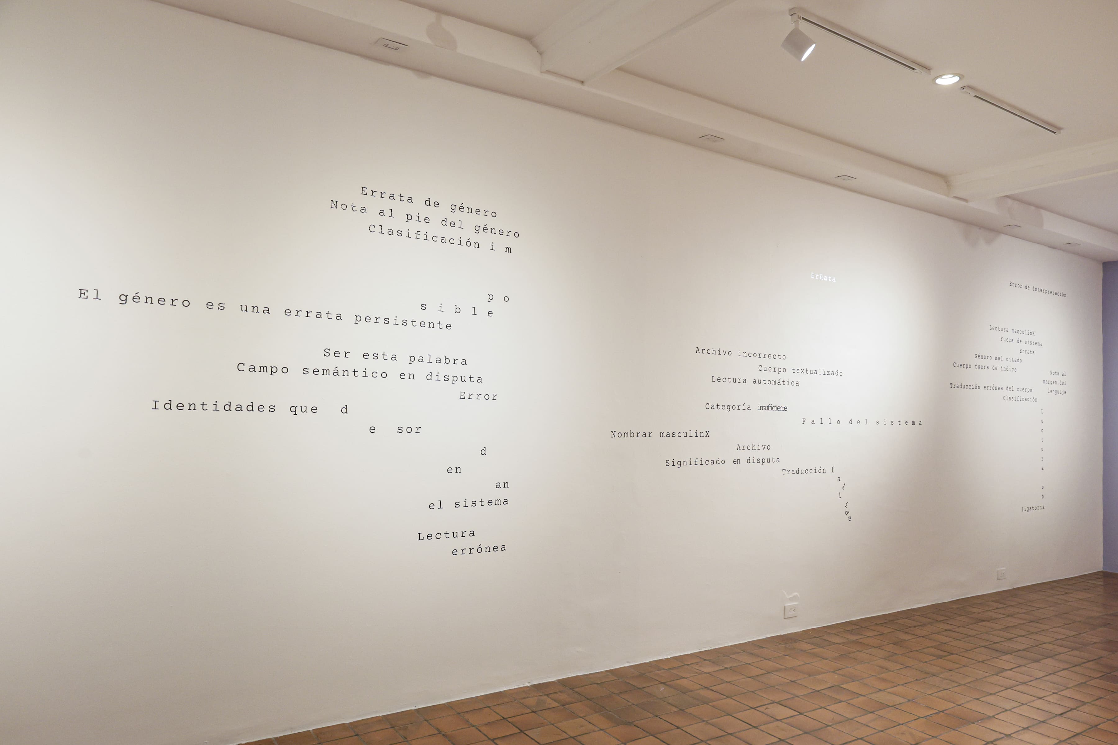 “Las frases, dispuestas en la pared con variaciones de escala, fragmentación y dirección, evocan procesos de anotación, corrección y reescritura. En ellas, el cuerpo aparece como aquello que es constantemente leído y nombrado dentro de marcos sociales que buscan hacerlo encajar. Sin embargo, el propio sistema deja ver sus fisuras: las palabras se interrumpen, se desplazan y fallan. En este contexto, el género no se presenta como una categoría estable, sino como una errata persistente: una forma que se corrige sin fijarse del todo, un proceso de interpretación siempre incompleto que evidencia los límites del lenguaje para contener la experiencia del cuerpo.”