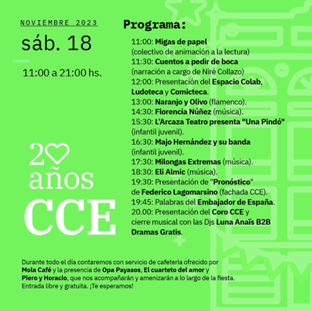Para celebrar estos 20 años de contribución cultural, el CCE ha preparado una emocionante jornada de aniversario el sábado 18 de noviembre, con una amplia variedad de actividades. Todas las propuestas son con entrada libre y gratuita.