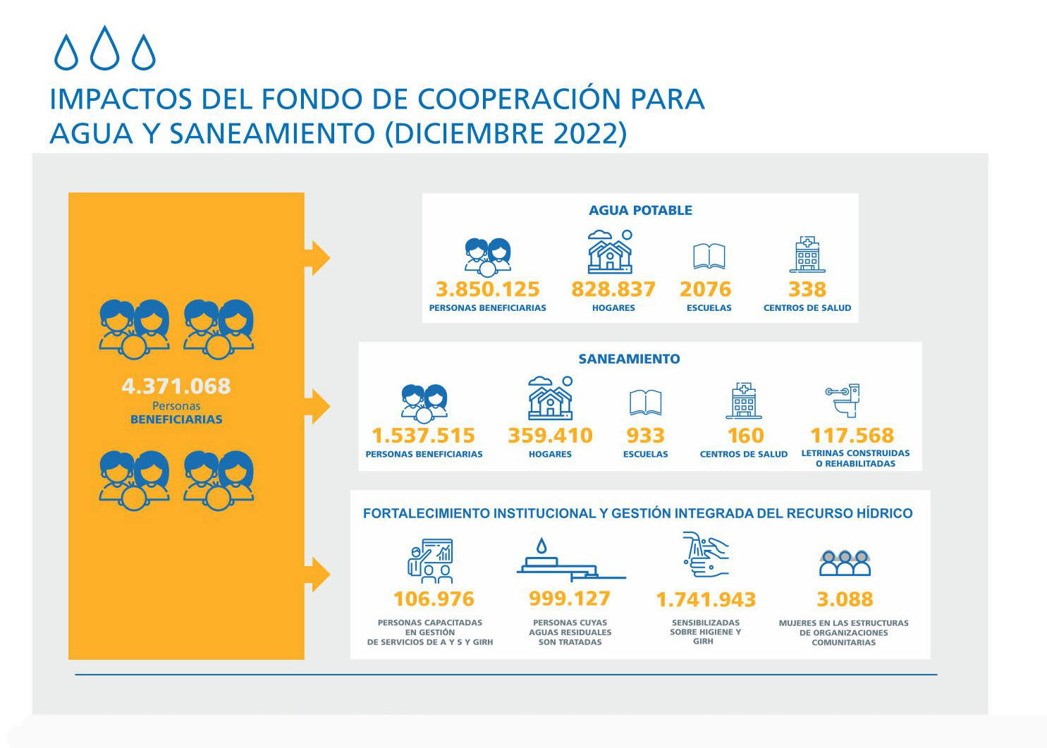 A través de galerías de imágenes, gráficos e infografías, y organizada tanto por áreas temáticas como por países de actuación, el lector puede conocer de primera mano cómo impactan las inversiones realizadas en los diferentes proyectos en la vida de las personas y sus comunidades. A lo largo del año 2022, el Fondo del Agua ha llevado acceso a agua potable a más de 340.000 personas y saneamiento a otras 145.000, superando los 4,3 millones de beneficiarios desde su puesta en marcha en 2009. Además, ha continuado trabajando con el foco puesto en el fortalecimiento institucional de los países socios, impulsando el desarrollo de marcos normativos e instrumentos para mejorar la gobernanza del sector.