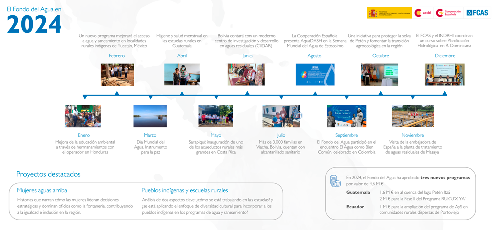 En el año 2024, el Fondo de Cooperación para Agua y Saneamiento (FCAS) ha alcanzado la cifra de 89 programas puestos en marcha en la región de América Latina y el Caribe, desde que comenzara su actividad en el año 2009. A fecha de diciembre 2024, la labor del FCAS suma ya 4,6 millones de personas beneficiarias desde su nacimiento y las donaciones han alcanzado los 815 millones de euros; de los cuales 4,6 millones se asignaron en el último ejercicio.