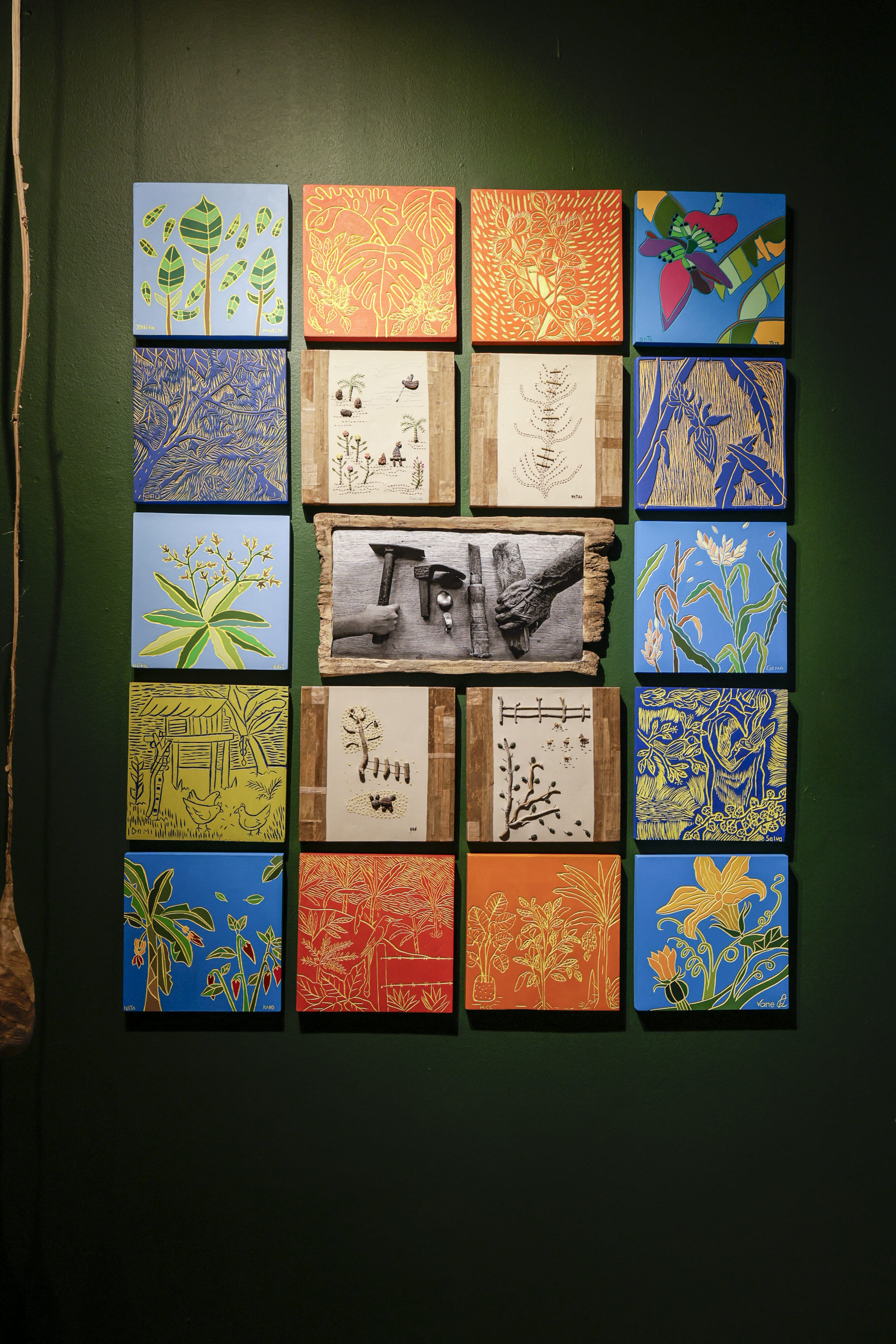 La instalación reúne piezas realizadas con materiales del entorno como hojas de cuadrado, madera, cabuya, semillas y fibras naturales. A través del trabajo colectivo y técnicas artesanales, la obra afirma la persistencia de estos vínculos frente a los procesos de precarización económica y transformación territorial que atraviesan la región.