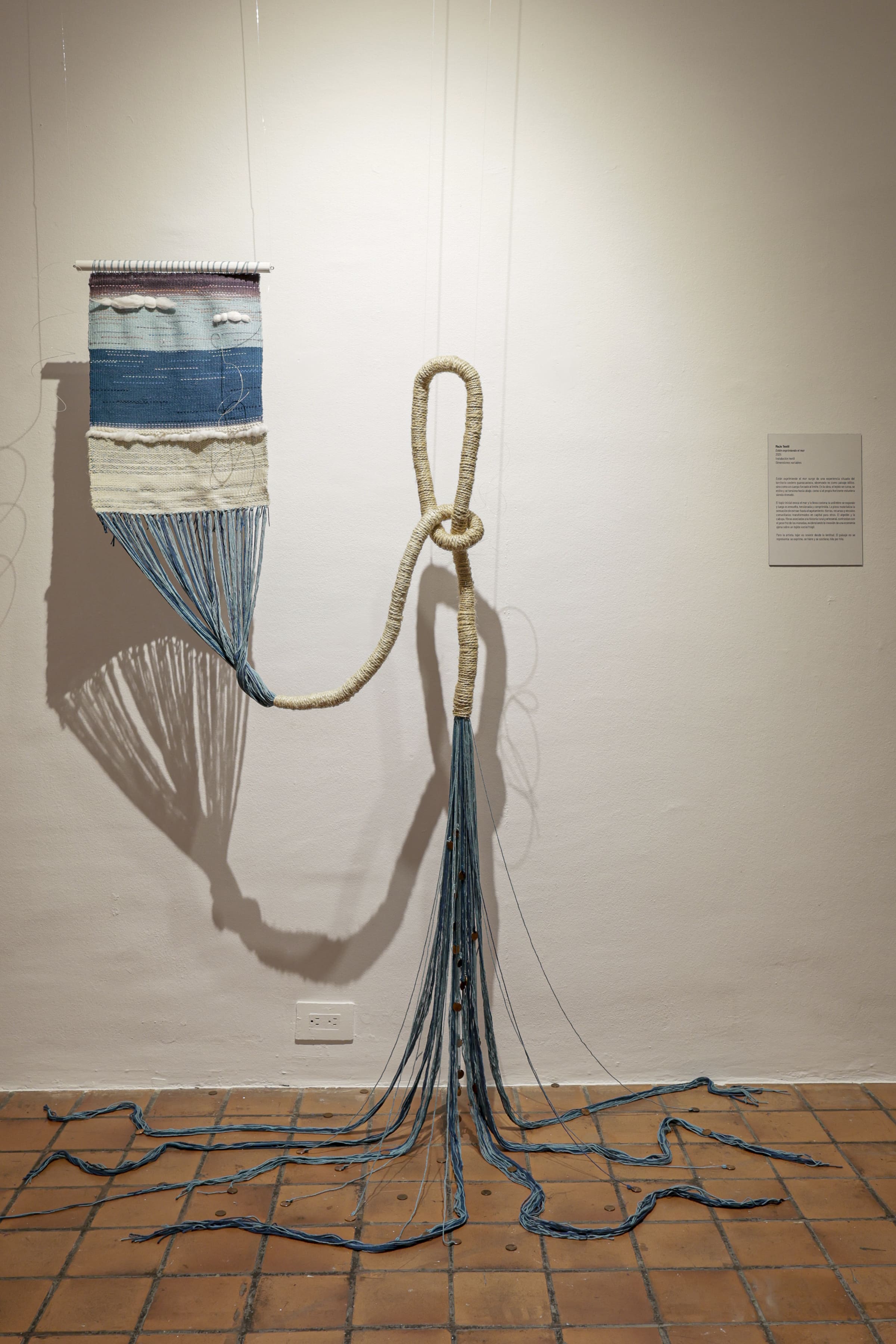 El tapiz inicial evoca el mar y la línea costera; la urdimbre se expande y luego es envuelta, tensionada y comprimida. La pieza materializa la sensación de extraer hasta el agotamiento: tierras, recursos y vínculos comunitarios transformados en capital para otros. El algodón y la cabuya, fibras asociadas a la historia rural y artesanal, contrastan con el peso frío de las monedas, evidenciando la invasión de una economía ajena sobre un tejido social frágil.