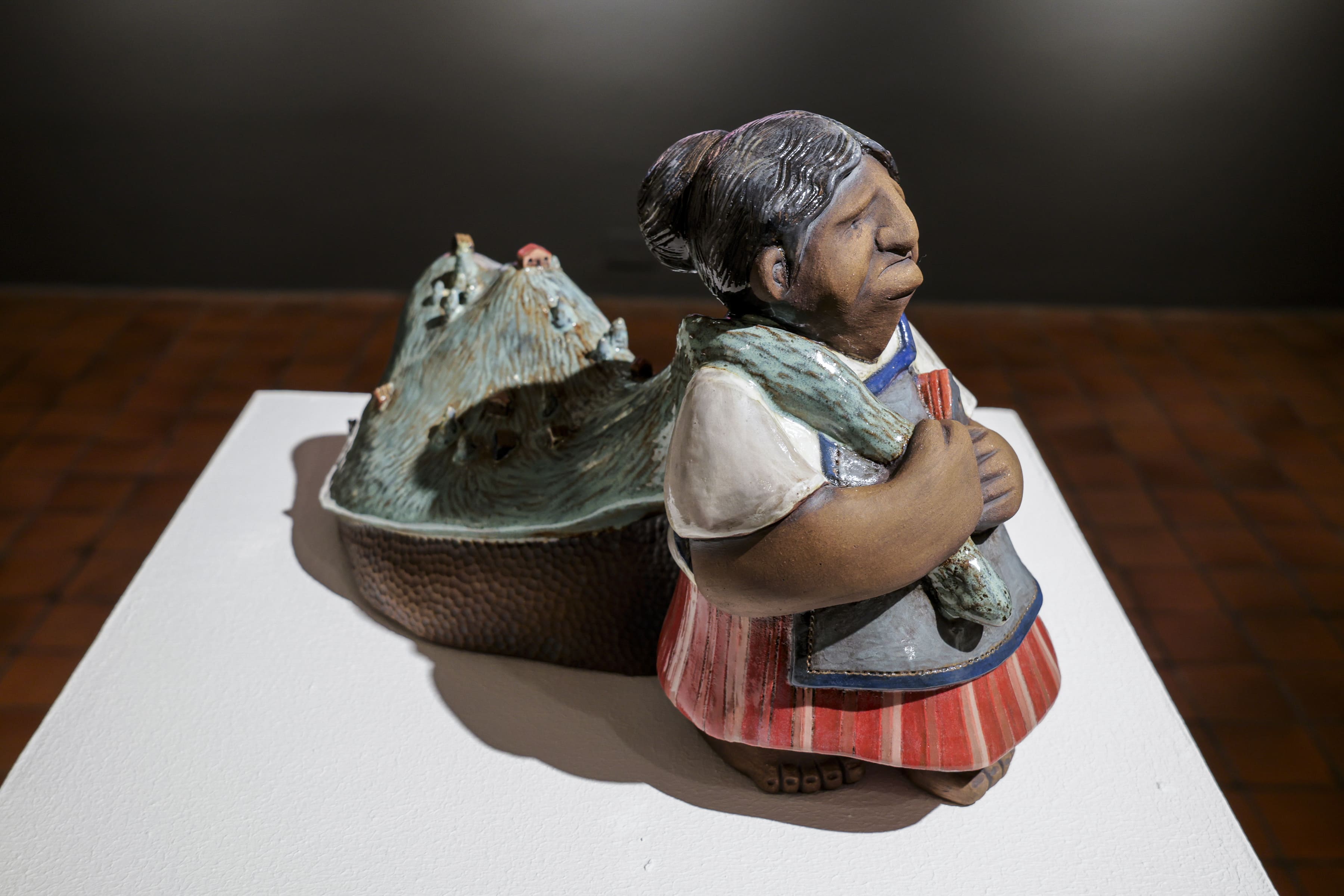Modelada en cerámica con acabados en esmalte y engobe, la pieza dialoga con la materialidad de la tierra y con los ritmos del trabajo rural. Cada gesto queda registrado en el barro, reforzando la relación entre cuerpo, tiempo y memoria. La escultura surge de una observación atenta de los procesos de desplazamiento que afectan comunidades rurales y costeras, especialmente a las personas mayores, para quienes irse no es solo mudarse, sino romper un vínculo profundo con el lugar vivido.