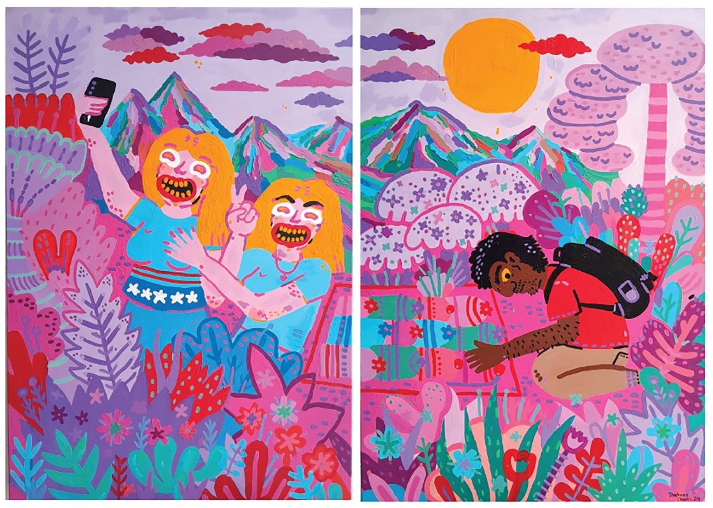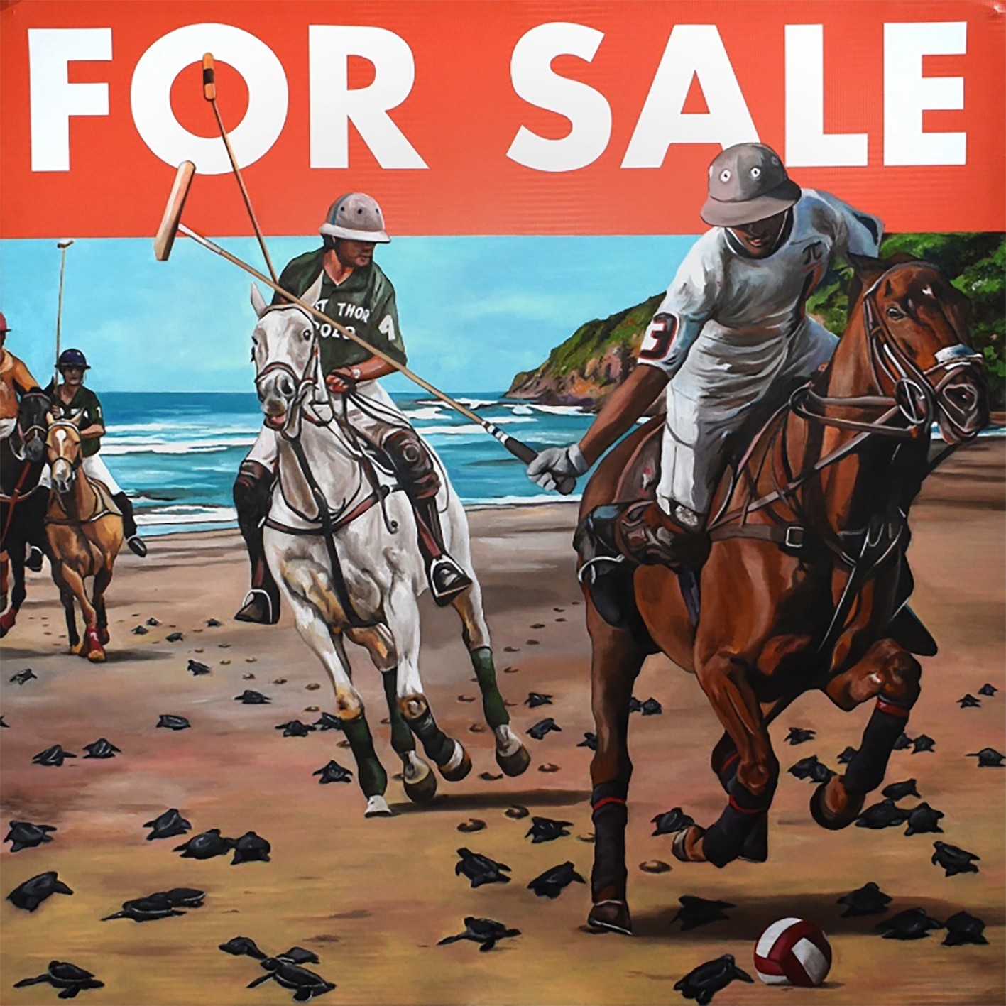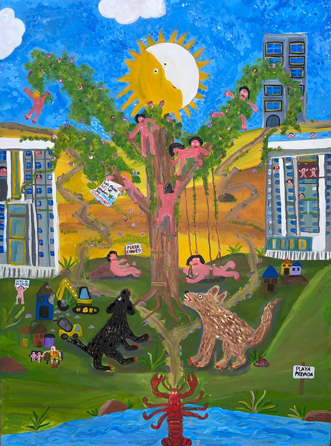 Aquí, el paisaje costero aparece intervenido por torres y rótulos que delimitan el acceso y convierten lo común en exclusivo. Los personajes, ingenuos, coloridos, casi festivos, no celebran: protestan, resisten, ocupan el espacio desde una fragilidad activa. El contraste entre la paleta pastel y el conflicto que se representa genera una tensión incómoda, donde la alegría visual no suaviza el problema, sino que lo hace más evidente.