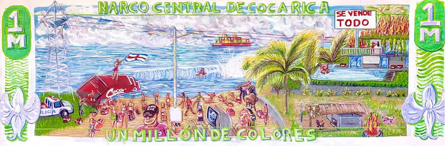 La obra traslada ese imaginario al presente: contenedores, turismo descontrolado, narcotráfico, feminicidios, arquitectura invasiva y fiestas sin límites conviven en un mismo paisaje costero. La parodia se refuerza con juegos de lenguaje como “Narco Central de Coca Rica” y el reemplazo de “colones” por “colores”, aludiendo tanto a la diversidad cultural como a la normalización del caos.