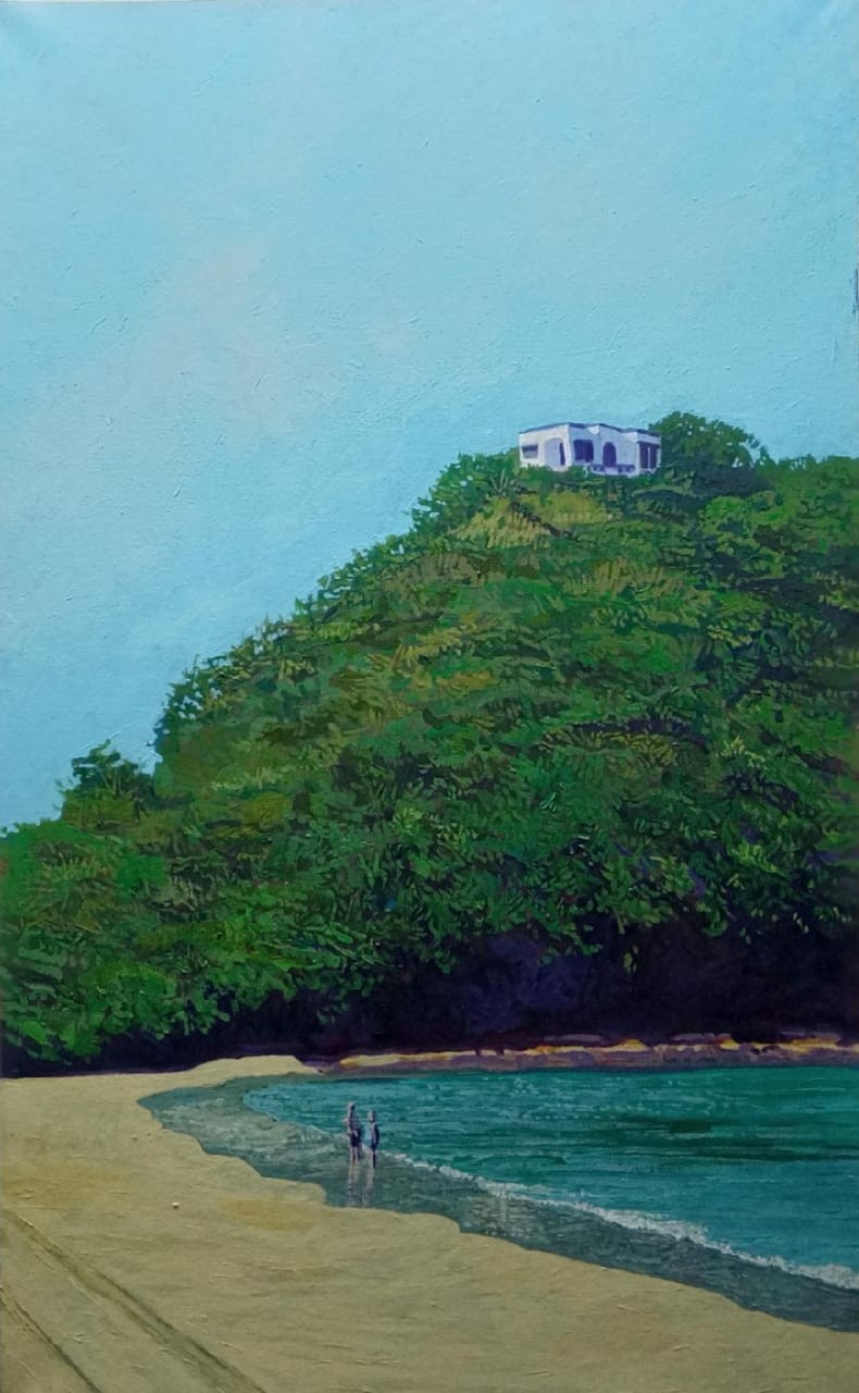 La casa del gringo retrata un paisaje costero aparentemente idílico: playa, vegetación densa y, en lo alto del cerro, una casa de lujo aislada. La escena, pintada plein air a partir de un lugar real en La Cruz, Guanacaste, revela cómo el territorio se ha transformado silenciosamente en las últimas décadas.