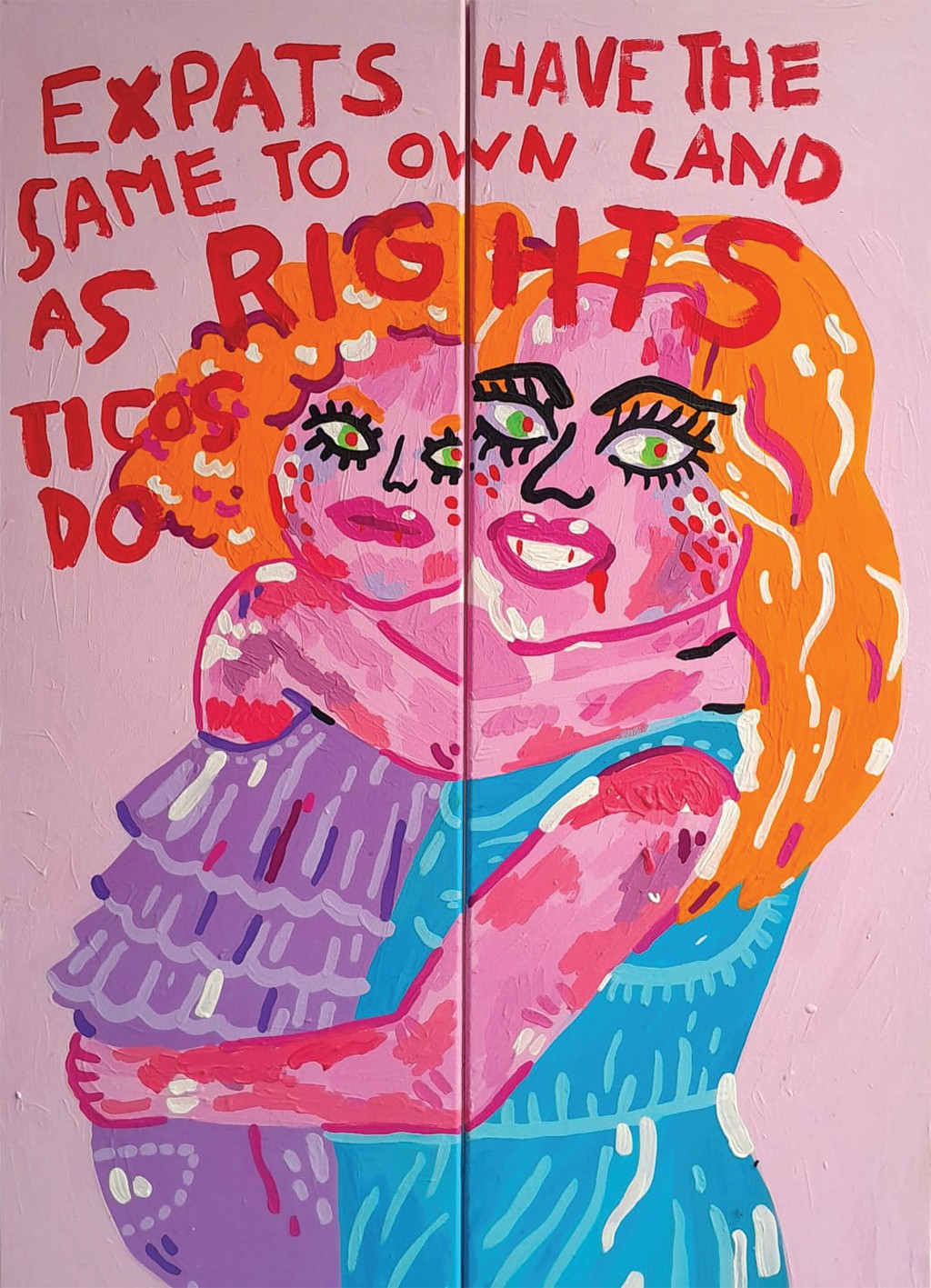 En esta serie pictórica, Stephanie Chaves confronta la idea de Costa Rica como “paraíso” desde una mirada crítica situada en la experiencia cotidiana de quienes quedan fuera de esa promesa. A partir de viajes a zonas turísticas como Jacó y Puerto Viejo, la artista observa la proliferación de rótulos inmobiliarios en inglés, el turismo sexual, el extractivismo cultural y las narrativas que normalizan la compra del territorio como derecho universal del capital extranjero.